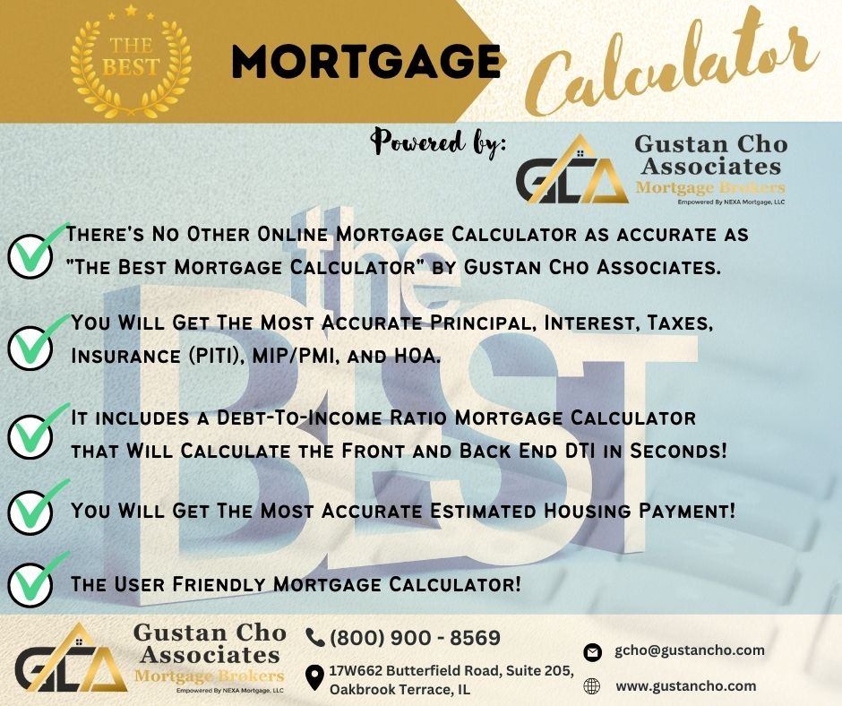 We are at Gustan Cho Associates, You easily check your mortgage eligibility with the best mortgage calculator With PITI, PMI, MIP, HOA, and DTI.